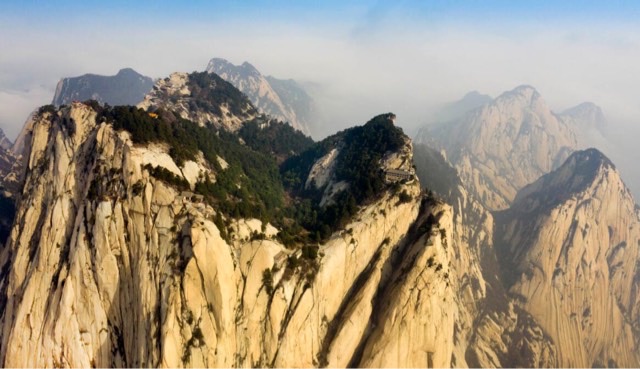 华山位于陕西省渭南市华阴市,在省会西安以东120千米处。南接秦岭山脉,北瞰黄渭,自古以来就有"奇险天下第一山"的美称。金庸老先生曾在书中留下了华山论剑这样的名场面,故使得形成每一个武侠迷都非常向往的地方。而且这里也是道教主流全真派的圣地。华山的主要景点有200多处,主要以奇险绝为主,有凌空架设的长空栈道,三面凌空的燕子翻身,还有在悬崖峭壁上凿出来的千尺幢,百尺峡。