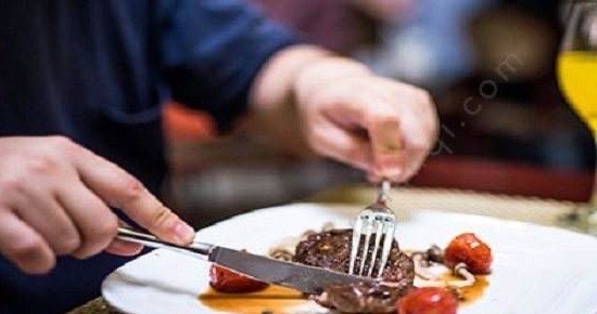 3、另外在用刀叉进行食物切割的时候不要让自己的肘关节抬得太高了,这样不容易切割食物。