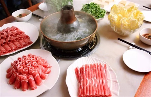 (3)在锅中烧开适量清水,将羊肉片放入涮煮,煮至羊肉变色后捞起,放入碗中蘸食。