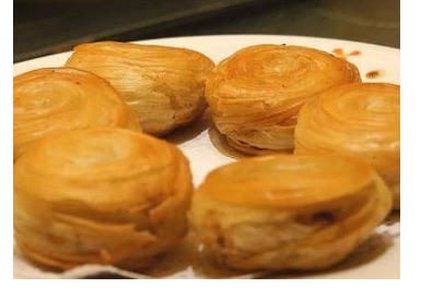 千层油酥饼是陕西特色小吃,相传是由唐代的千层烙饼经历代厨师不断精心改进而成,色泽金黄、层次鲜明、脆而不碎、油而不腻、香酥适口。