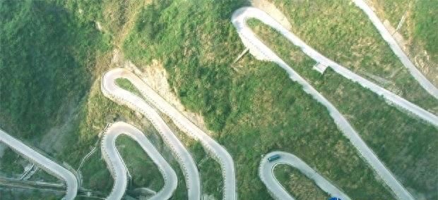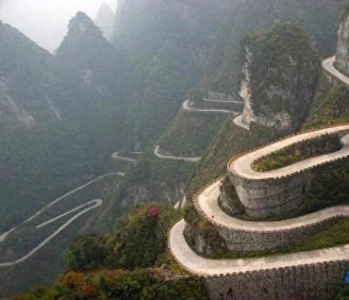 张家界天门山盘山公路有”通天大道”之称,盘山公路全长10.77公里,海拔从200米急剧提升到1300米,大道两侧绝壁千仞,空谷幽深,共计99个弯,180度急弯此消彼长,似玉带环绕,弯弯紧连,层层迭起,被誉为“天下第一公路奇观”。