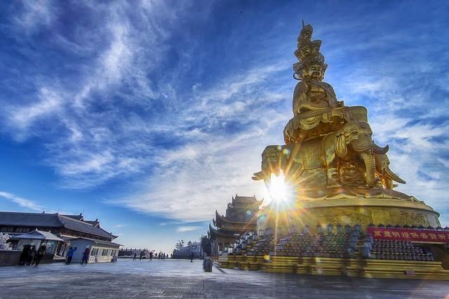 十方普贤金像位于峨眉山金顶,通高48米,重达600多吨,建筑面积1000㎡,是世界上最大、最高的普贤铜像。金佛通高48米代表的是阿弥陀佛的48个愿望。