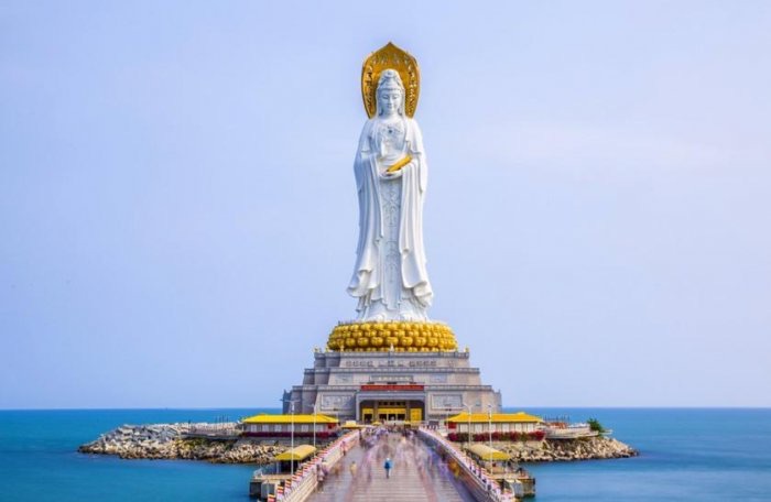 海上观音,位于海南省三亚市,世界最大的白衣观音造像高108米,一体化三尊,巍峨壮观。海上观音坐落于三亚南山,钛合金建造,是世界上最高的观音像。