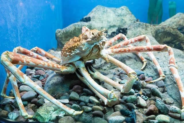 巨型蜘蛛蟹又名卡氏大螯虾,是现存最大的甲壳类动物,也是十足目蜘蛛科大螯虾属的唯一物种。身体呈深橙色,有十条长长的四肢,上面有白色斑点,前两条四肢发育成钳子。最大的一条腿长4.2米,长38厘米,重20公斤,寿命100年。身体前方长着两只复眼,两眼之间有两根刺。它生活在从日本岩手到台湾东北角的太平洋海底泥泞地形,深度500-1000米,平均温度10-15摄氏度。它以鲨鱼、盲鳗、螃蟹和各种鱼类为食。