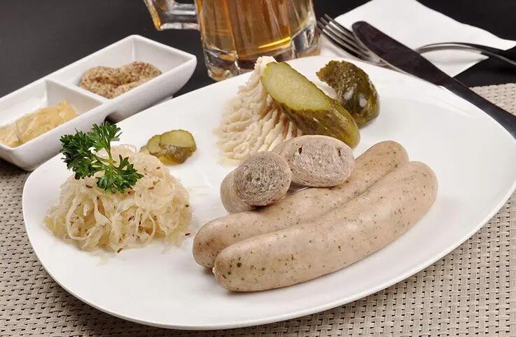 慕尼黑白香肠因白色的外表而得名,它是由剁碎的小牛肉、烟熏猪肉和众多调味料如香芹、肉豆蔻、洋葱、姜等制成。 这种肠在烹调的时候必须用70度左右的盐水加热,绝对不可以用沸水,否则会爆裂,味道也会流失。
