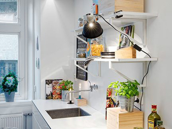小厨房在收纳的时候,是不太建议使用太多的橱柜的,因为它反而会占用厨房的空间。所以我们的办法是采用置物架的*来储存物品。同时留出一个简单空位做个卷帘。那么里面可以摆放一些常用物品,用完后放回原位,这样就可以节省空间了。