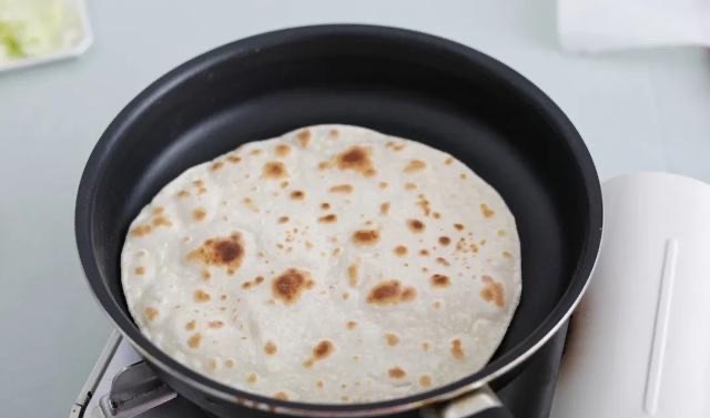 平底锅烧热小火,不用放油,放入饼皮,变色后翻面。