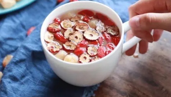 将枸杞和红枣泡在热水中,具有养肝益气、滋补血液的功效。