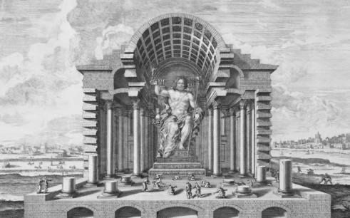 宙斯神像位于希腊西海岸的古城当中,建造于公元前457年。宙斯被认为是希腊众神之首,宙斯神像是当时世界上最大的室内雕像,其所在的宙斯神殿是奥林匹克运动会的发源地。神像本身的高度大约是12米,采用了一种被称为克里斯里凡亭的技术,木质的支架外加象牙雕成的肌肉和精致的衣服饰品。宙斯神像不仅仅是当时雕塑艺术的巅峰,也是古希腊文明最为重要的象征。 3. 罗德岛太阳神巨像