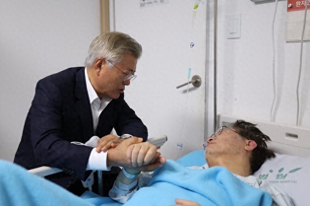 报道称,文在寅紧握李在明的手,面色沉重地与他交谈20多分钟,期间李在明试图起身,但被文在寅制止。