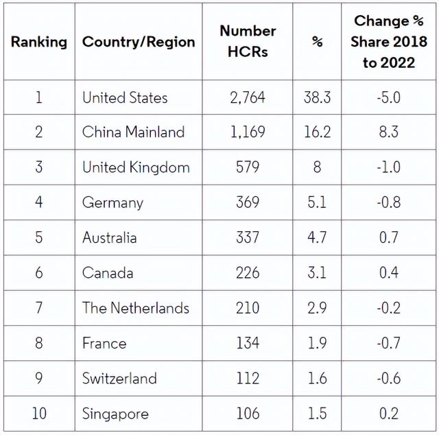 中国内地今年继续排名第二,有1,169名研究人员上榜,占总人数的16.2%,高于2021年的14.2%、2020年的12.1%、2019年的10.2%和2018年的7.9%,连续4年获得提升,进一步缩小了与美国的差距。