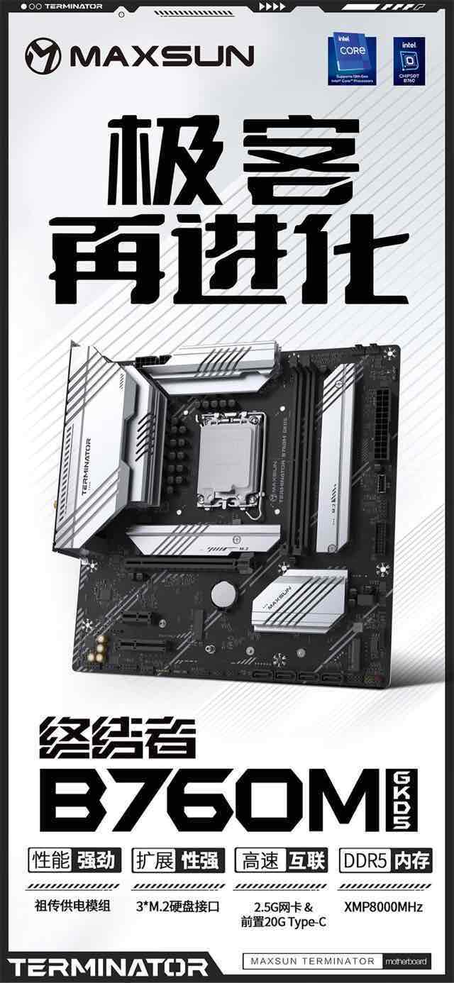 铭瑄 MS-终结者 B760M GKD5 主板现已上架并开启预约,首发价 829 元。这款主板采用 MATX 板型,尺寸 245×245mm,依然是 8+1+1 相供电,整合 50A Dr.Mos,优化双槽内存,支持 XMP8000(OC),前置 20Gbps 的 Type-C 接口,支持 USB3.2 Gen2x2。