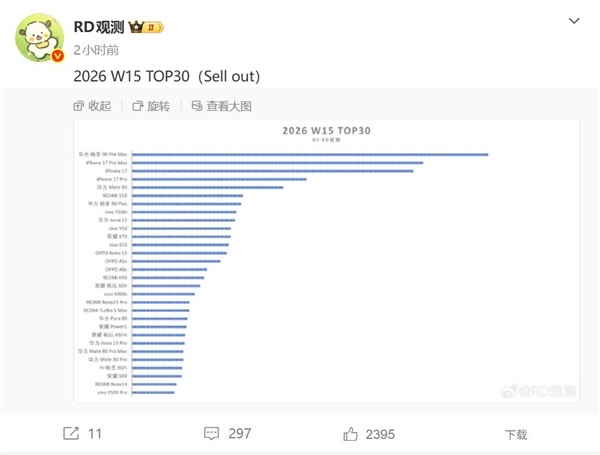 4月18日消息,根据博主RD观测发布的最新数据,在2026年第15周,华为畅享90 Pro Max的销量成功跃居行业第一名。其市场表现甚至超越了在售的iPhone 17 Pro Max和iPhone 17。