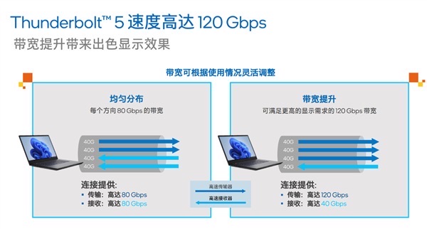 雷电5的带宽也不再固定,而是根据使用情况灵活调整,比如需要大量传输而接收较少的时候,可以将三个通道都用于传输,此时带宽提升至120Gbps。
