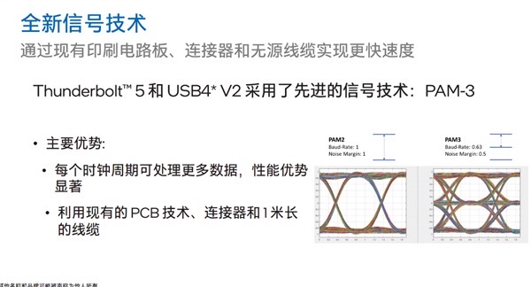 对于雷电5为何不用PAM-4,Intel解释说主要是PAM-3在技术上足够使用,成本也可以很好地控制,且兼容部分现有组件,综合考量下来是最合适的,PAM-4则有更高的技术门槛。