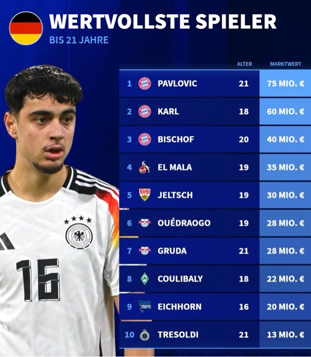 德国转会市场网站盘点了德国U21球员身价前10球员,帕夫洛维奇以7500万欧元最高身价领跑榜单,卡尔6000万欧元排名榜单第二位。