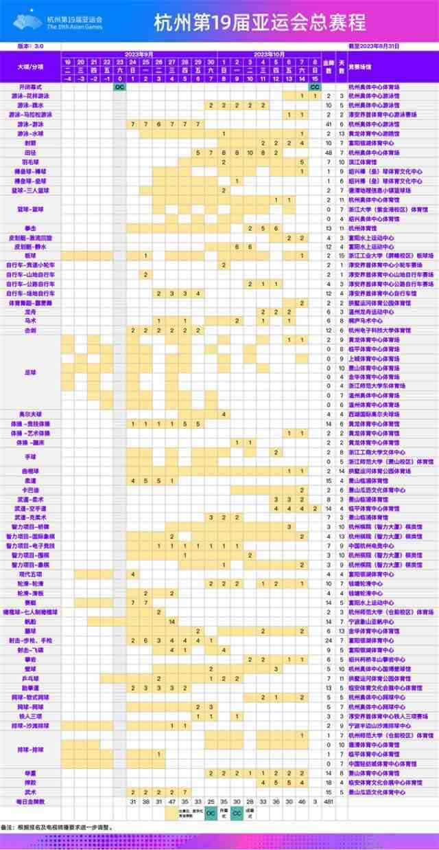 9月9日消息,据杭州亚运会官网显示,根据最新报名调整情况,经杭州亚运会各项目技术代表确认,杭州亚运会总赛程更新至3.0版,现予以发布。