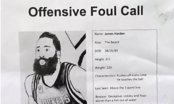 哈登通缉令是很多球迷对于哈登的针对,也是因为哈登的太过强大,最早哈登通缉令是盐湖城球迷的手笔,其中通缉令上要通缉的是哈登的进攻犯规,表明了哈登很多的行为,最终通缉令的奖赏,写的是:“你的尊严,裁判”, 写这张通缉令的人敦促裁判,每当哈登在比赛中出现进攻犯规的时候,一定要记得吹响哨子,很显然,这是爵士球迷在今天双方第3场比赛开始之前黑哈登的一个手段。