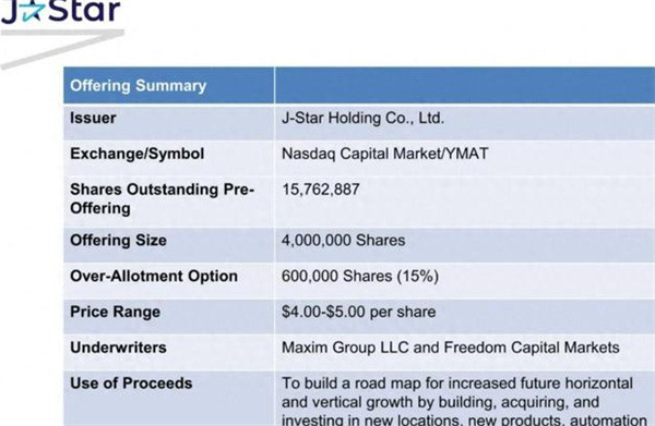 J-Star Holding是中国台湾地区的碳纤维制造商,日前向美国证券交易所递交了招股书,计划冲刺美股。设置的股票发行价格大约在4~5美元之间,预计发行的股票数量是400万股,募集的最高金额达到美元2,000万。