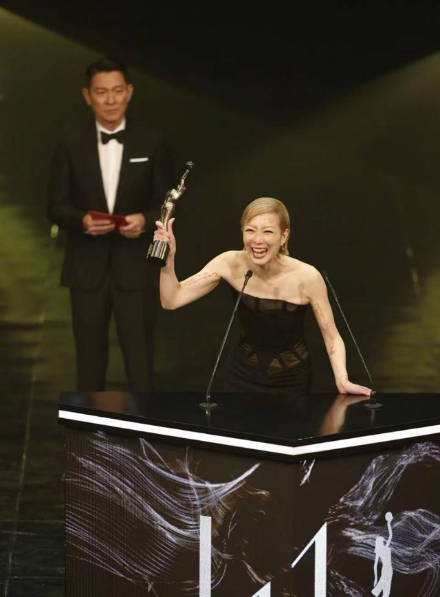 她走上舞台,拥抱老搭档刘德华,从他手中接过奖杯,泪流满面地转身。【周边网】