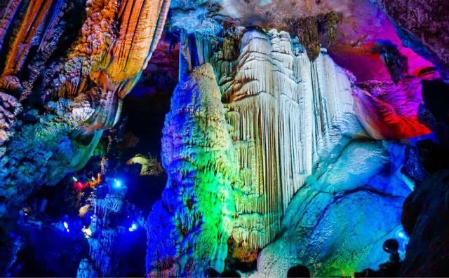 银子岩位于桂林市荔浦县,属于典型的喀斯特地貌,其溶洞贯穿十二座山峰,洞内汇集了不同地质年代发育生长的钟乳石,晶莹剔透,洁白无瑕,宛如夜空的银河倾斜而下,闪烁出像银子一样的光芒,所以称为“银子岩”。