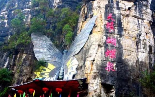 蝴蝶泉是一个集奇山、秀水、幽洞、田园风光为一体的旅游景区,位于桂林阳朔月亮山风景区“十里画廊”的精华地段,有“不到蝶山顶,不知阳朔景”之美誉。 蝴蝶泉因蝶洞内有一股泉水从山腰悬崖涌出而得名。是中国最大的活蝴蝶观赏园,有上千种、数万只蝴蝶与人和谐相处。蝴蝶泉还是鸟瞰阳朔“香格里拉”遇龙河和羊角山等精华田园风光的最佳观赏台。