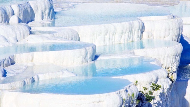 巴姆凯莉是白色的天地,“巴姆凯莉”在土耳其语也是“棉花”的意思。这里遍地是白色石灰岩,偶尔几长出花草,更加点缀了巴姆凯莉的的美景景致。
