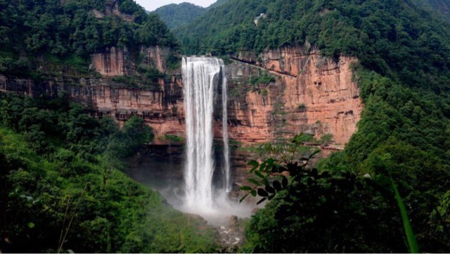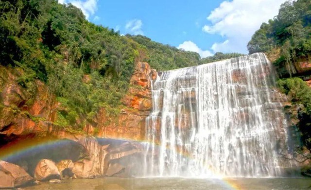 赤水大瀑布,位于贵州省赤水市南部,赤水河支流风溪河上游。整个赤水有瀑布超过1000多个,是世界上最大的瀑布群,因此被誉为“千瀑之市”。其中最知名的部分“十丈洞大瀑布”,高76米,宽80米,是我国丹霞地貌上最大的瀑布,也是我国长江流域上最大的瀑布。