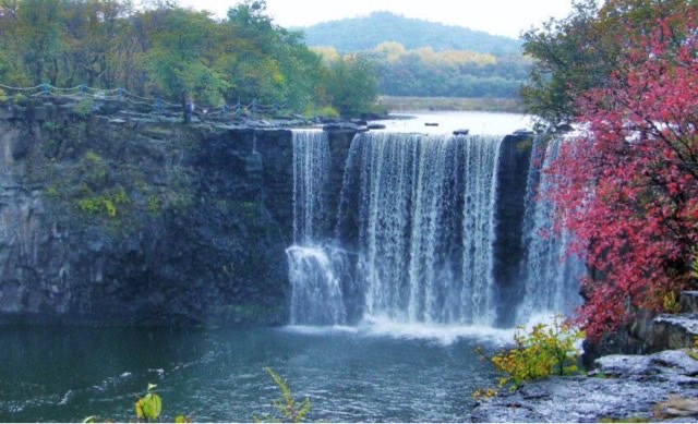 吊水楼瀑布,又称镜泊湖瀑布,它位于黑龙江省牡丹江市宁安市西南部,镜泊湖之北端。瀑布宽约70米,雨水量大时,宽300余米。落差20米。它形状好像加拿大尼亚加拉大瀑布,是世界最大的玄武岩瀑布。