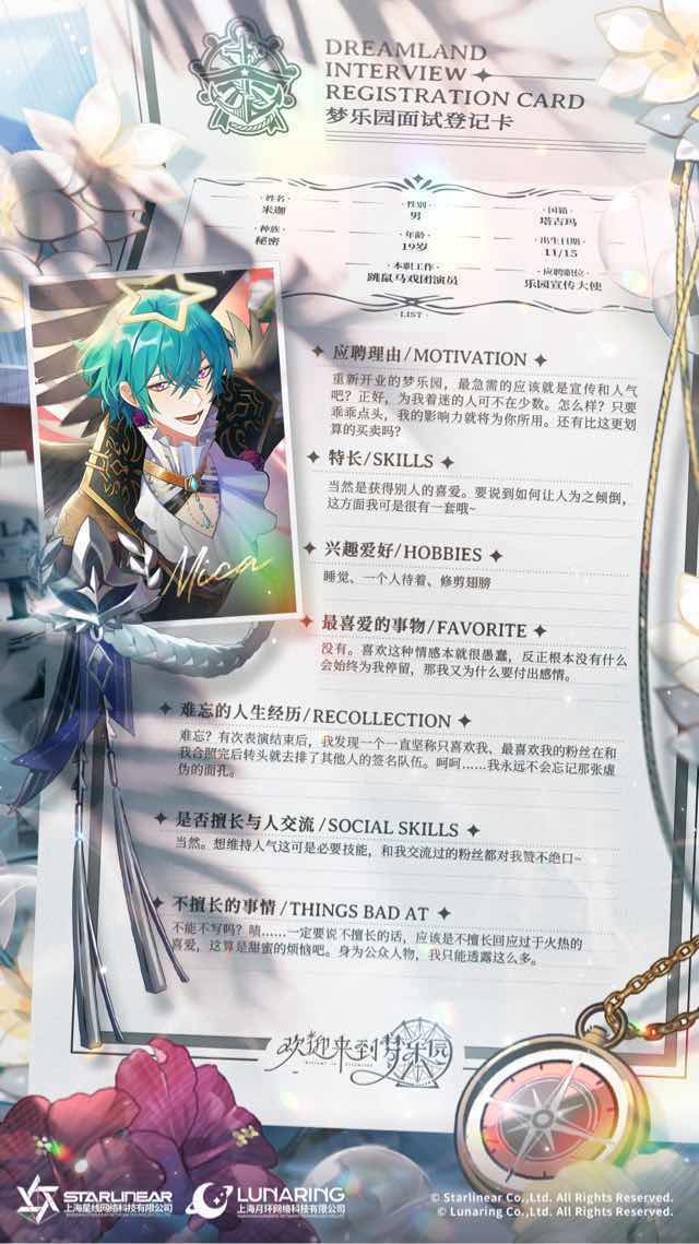 马戏团的招牌明星,对外介绍是非常稀有的天使种族,理所当然也拥有天使外表、天使性格与天使一样闪闪发光的纯善之心!头顶的天使光环当然也是魔法效果,米迦一度很厌恶这个光环,直到他发现可以在晚间阅读时作为小夜灯使用,能省下不少电费,他逐渐满意。
