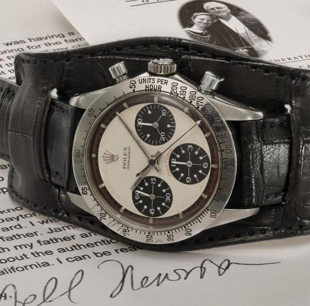“保罗纽曼”是迪通拿中价值最高的品类。由于被美国演员保罗纽曼佩戴过,因此得名。进而延伸为但凡使用这种熊猫盘面,方形计时盘刻度的迪通拿都被称为“保罗纽曼”,型号覆盖6239、6240、6263等。而这只表,是美国演员保罗纽曼,自己拥有的那只“保罗纽曼”。历史意义,名人加成,让这只表最终“封神”。