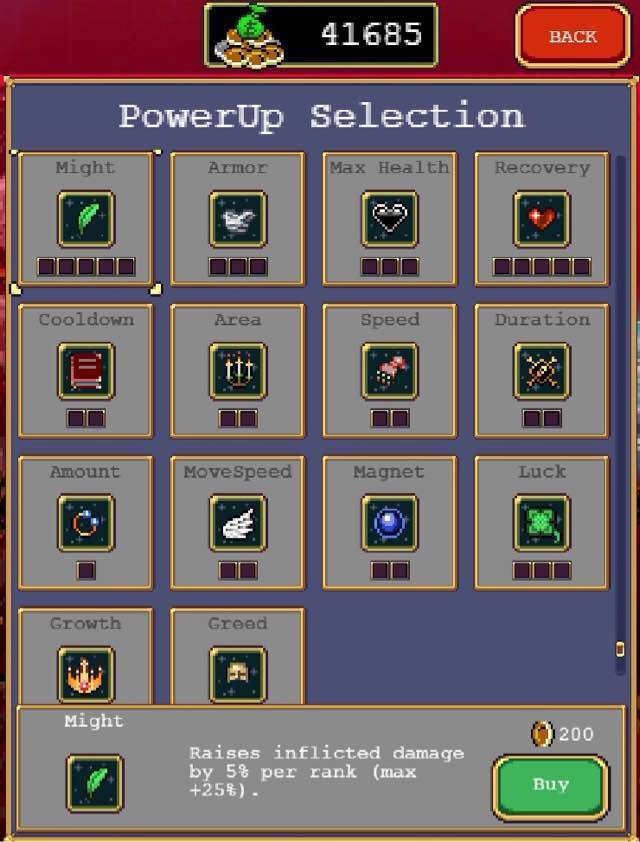 可通过开宝箱、捡金币等方式获取金币,用于升级通用属性,这里升级会发生价格递增,但是游戏带重置功能,可随时调整通用属性。因为和被动的图标基本一致,就不做过多额外介绍。介绍我的升级顺序:5000钱以前,升级伤害、移速。5000以后,优先双发,然后加伤害、冷却、范围、磁铁、移速等实用属性。