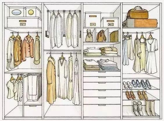 衣柜内部布局设计,要根据你家人的需求来设计,比如家人喜欢叠衣服多,那就多一些叠衣区,家人喜欢挂衣服,那悬挂区就多一些,这个如果你不提需求的话,有些设计师,就随便帮你找个模板就设计好了,所以这个要特别注意。