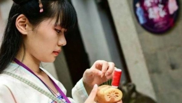 在乞巧节这天晚上,大家会搭建乞巧楼,然后摆上瓜果,换上崭新的衣物,然后穿一端具有七个针孔的针,要是谁穿针的速度快,就代表谁心灵手巧。这个习俗的主要寓意就是希望可以得到织女的指导,使得自己能够快速的织布缝衣,成为这方面的一个能手。