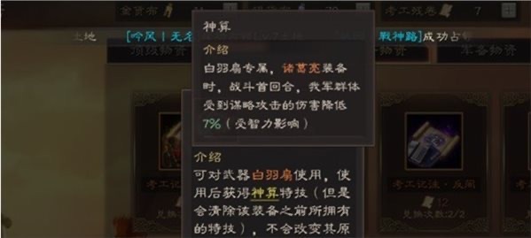 三国志战略版神算特技什么效果?神算是诸葛亮白羽扇的专属特技,需要使用12个残卷来兑换,它的效果主要是降低全军受到的谋略伤害,那么它值不值得玩家们用残卷来兑换呢?下面就让小编给大家带来三国志战略版神算白羽扇分析,看看它是不是你正需要的武器特技呢。