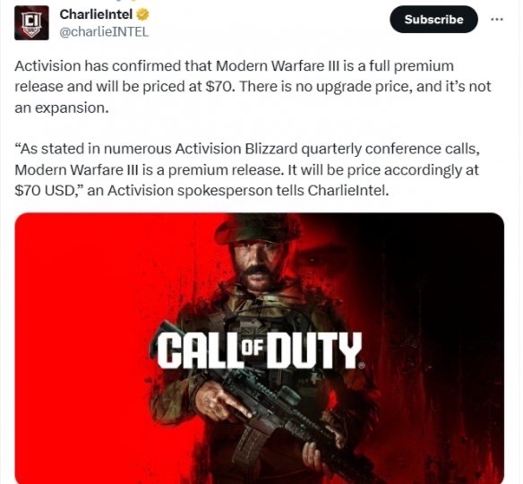 推主CharlieIntel表示,动视已确认《使命召唤:现代战争3》的定价为70美元,是完整的高级版本,没有升级价格,也不是资料片。