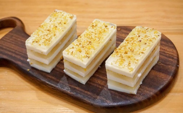 桂花糕有三百多年的悠久历史,在明朝末年就已经出现了,是用糯米粉、糖和蜜桂花为原料制作而成的,味道爽口细腻,口味香甜,具有浓郁的桂花清香。