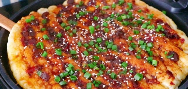 18.煎好后,在任何一面饼上刷上豆豉香辣酱。