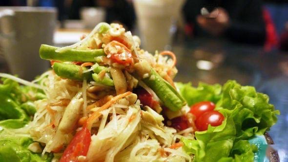 辣味青木瓜沙拉是一种以青木瓜丝为主料,配以鱼露、柠檬汁、蔬菜丝、大蒜和辣椒的凉拌沙拉,口感辛辣。