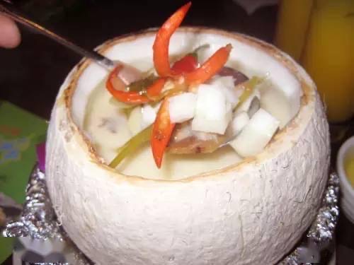 泰式椰汁鸡汤可谓是曼谷名汤,已有数百年的历史。因为椰奶带甜味,又比较油腻,所以一般在泰国菜中,椰奶多用作咖喱菜肴之调味或调色,极少作烹汤用。