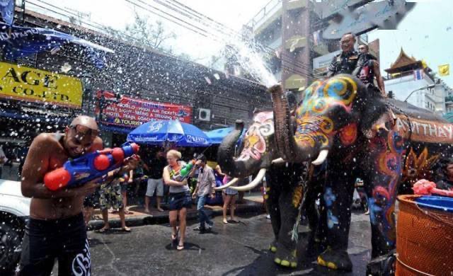 泰国的新年,全国放假四天。每当此刻,举国欢庆,曼谷尤甚。在节日里孩子会把水泼到长者的手上,在水花四溅中祈求他们的祝福。最受尊敬的佛像??帕辛佛(Sihing)将被展出,会有上千佛教弟子向他泼水。庆典活动还包括打水仗,这在炎炎4月的泰国是一种降温的好办法。