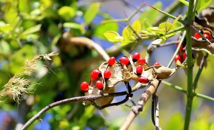 念珠豌豆大多生长在热带地区,或许对我们而言较为陌生,但其实在热带地区非常常见。念珠豌豆是从叶荚中长出的红色果实,看上去有点像红豆,但是于红豆不同的是,念珠豌豆的果实是晶莹剔透的红色,吸引着人们的目光。而正是因为这鲜艳的颜色,念珠豌豆的毒性并不简单,倘若误食很有可能会因此丧命。
