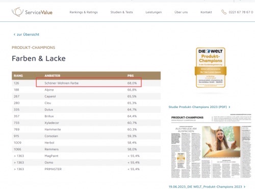 近日,德国知名调查机构ServiceValue联手DIE WELT发布了德国2023年产品冠军榜。SCHÖNER WOHNEN-Farbe(舒纳沃恩)凭借卓越的产品实力,以68%的PBS得分,再次斩获“涂料”类别第一的排名,荣登产品冠军榜单。第二名、第三名分别是得分66.8%的Alpina(阿尔贝娜)以及得分65.5的Caparol(德爱威)。