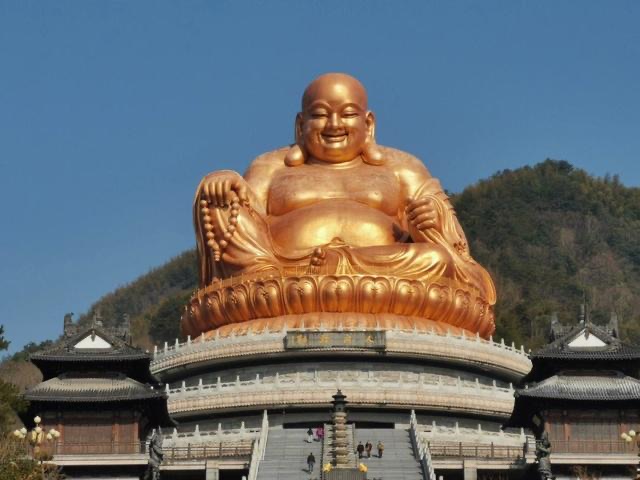 雪窦山弥勒大佛位于浙江省宁波市的雪窦山,大佛总高56.74米,坐北朝南,左手提布袋,右手握佛珠,慈眉善目,笑容可掬。