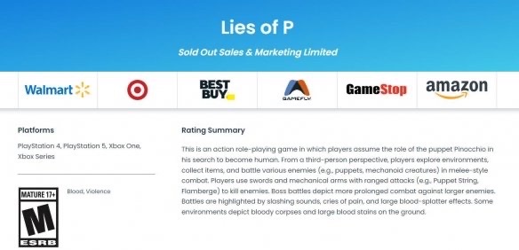 近日,由NEOWIZ开发并发行的类魂游戏《匹诺曹的谎言》通过了ERSB评级,级别为M级(成熟,17+),包含血腥、暴力元素,根据评级信息透露,该作拥有大型的Boss战斗场景。