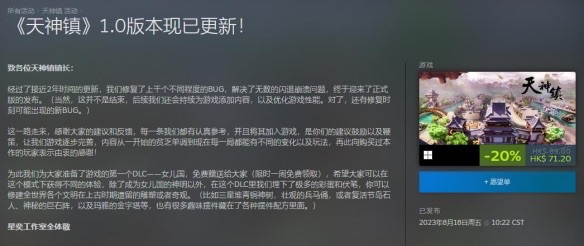 星奕工作室开发的《天神镇》目前已推出1.0正式版,游戏目前正在Steam上进行促销,折后价54.4元,此次促销活动将进行到8月25日。同时为感谢玩家支持还赠送了游戏的第一个DLC“女儿国”,限时一周免费领取。感兴趣的小伙伴千万不要错过了。