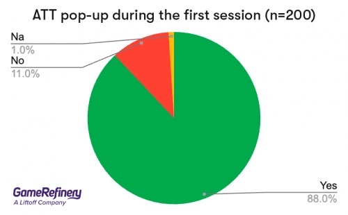 在这项研究中,我们发现绝大多数抽样游戏(88%)都在游戏开始后25分钟的抽样时间段内弹出ATT窗口。这个数据表明,应用程序开发商遵守苹果公司的新隐私政策已是大势所趋。