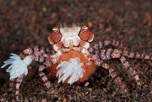拳击蟹主要生活在坚硬的珊瑚礁附近。为了进行有效的防御,它们用爪子捕捉有毒的海葵。当它们遇到捕食者时,拳击蟹就像戴拳击手套的拳击手一样,在捕食者面前挥舞海葵的有毒触角。它原产于东南亚至澳大利亚的珊瑚礁水域。没有大而特殊的身体,没有引人注目的爪脚,也没有特殊的颜色。爪脚上有两只小海葵。通常,成年螃蟹长2-5厘米。