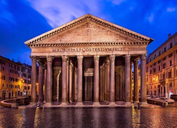 万神殿,又译潘提翁神殿,是至今完整保存的唯一一座罗马帝国时期建筑,始建于公元前27-25年,由罗马帝国首任皇帝屋大维的女婿阿格里帕建造,用以供奉奥林匹亚山上诸神,可谓奥古斯都时期的经典建筑。万神殿采用了穹顶覆盖的集中式形制,重建后的万神殿是单一空间、集中式构图的建筑物的代表,它也是罗马穹顶技术的最高代表。是古代建筑中最为宏大,保存近乎完美的,同时也是历史上最具影响力的建筑之一。