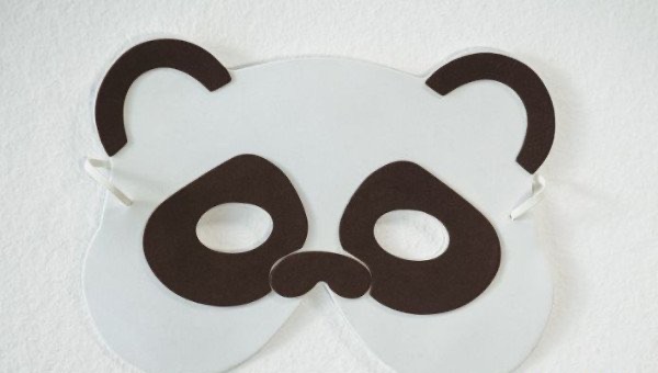 3.对折白色卡纸,将耳朵沿着笔迹剪下来,然后将其摆放在面具两边合适的位置,再用相同的办法制作出嘴巴和鼻子。